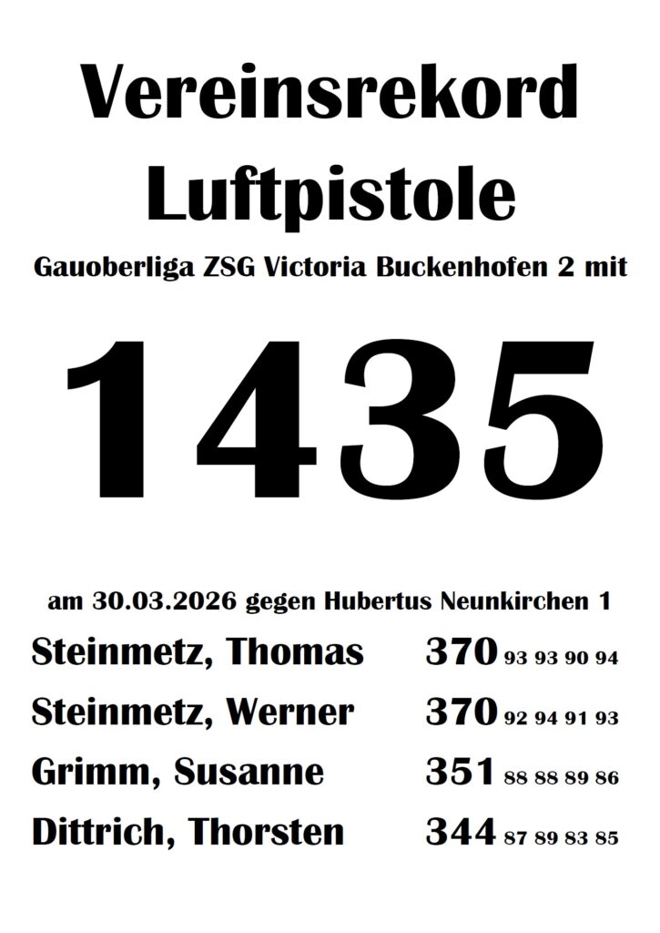 Unsere zweite Luftpistolenmannschaft konnte den, von ihnen im letzten Jahr aufgestellten, Vereinsrekord um 5 Ringe überbieten. Bei dem Tabellenstand von 22:0 Punkten rückt der Aufstieg in die Bezirksliga in greifbare Nähe.